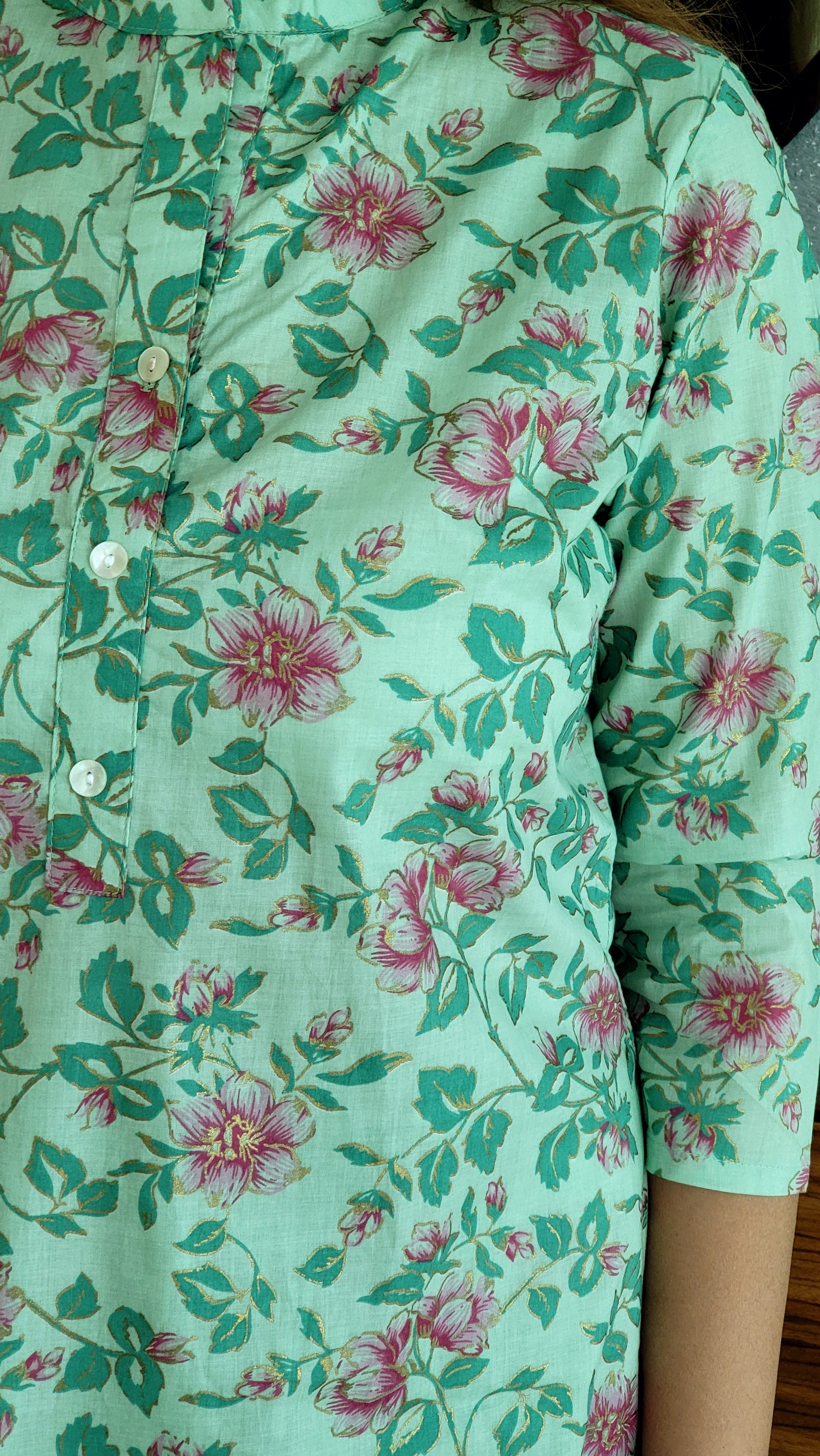 A soothing mint green kurta set with soft pink floral print, tailored in breathable pure cotton for everyday elegance.. The kurta has a pocket on one side. The pant also has a pocket on one side.