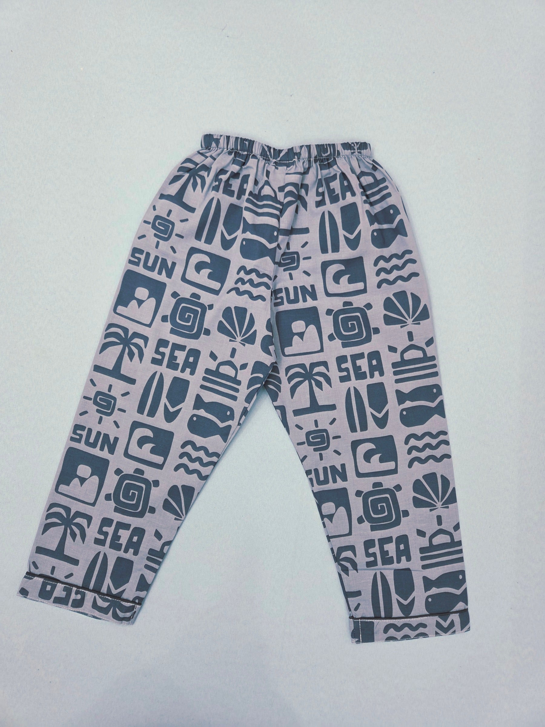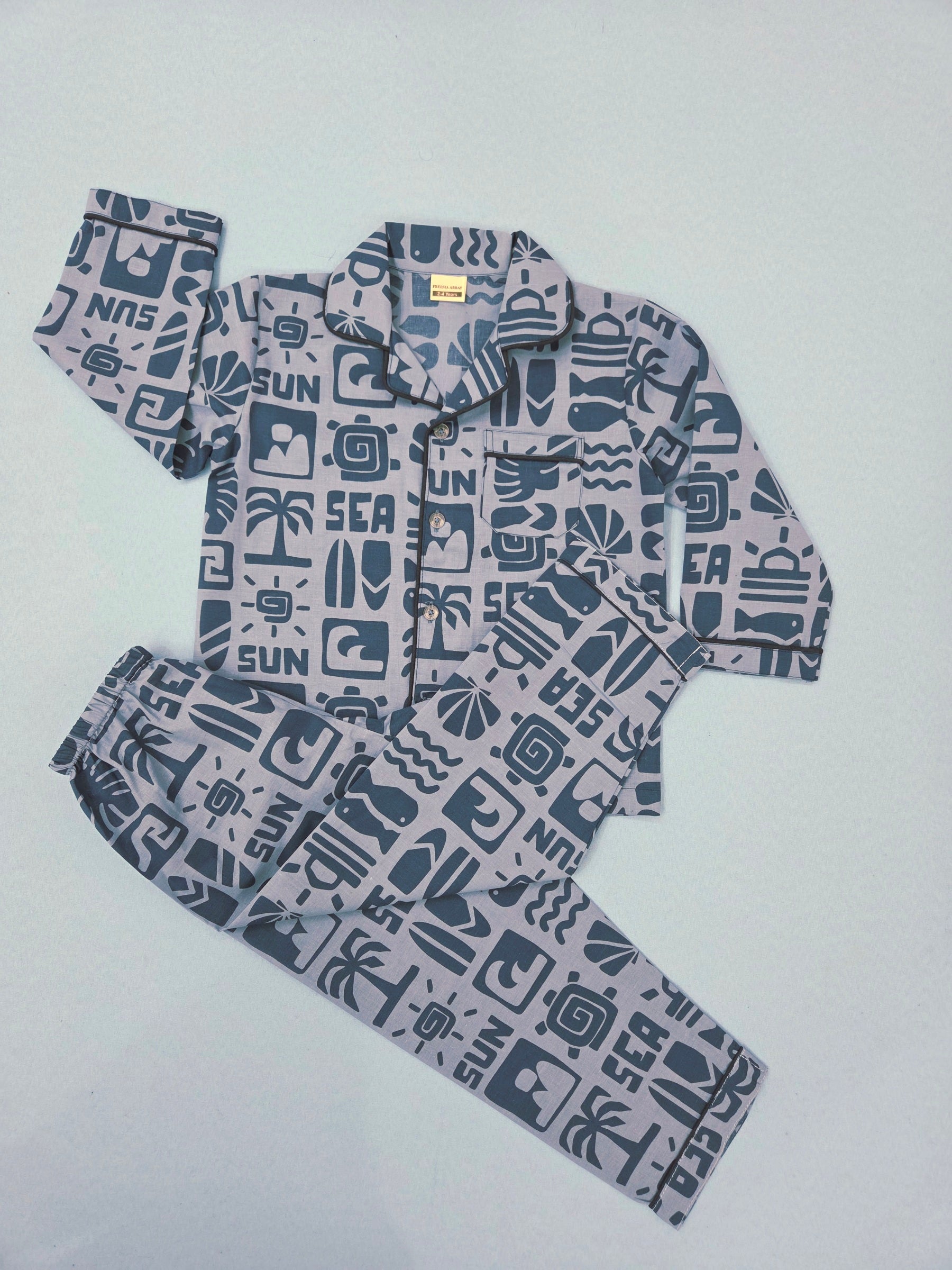 This vibrant unisex collared cotton nightsuit for kids brings a playful touch to bedtime with its fun sun and sea graphic print. The pajama set features a comfortable collared shirt with button-front closure and matching bottoms, both adorned with an eye-catching pattern of palm trees, surfboards, waves, and beach-inspired motifs. Crafted from soft cotton fabric, this nightsuit ensures breathability and comfort throughout the night, making it perfect for year-round wear. The relaxed fit allows for unrestricted movement during sleep, whilst the elastic waistband on the trousers provides a secure yet comfortable fit. Suitable for both boys and girls, this versatile sleepwear set combines style with practicality. The playful design featuring 'SUN' and 'SEA' text elements alongside tropical graphics makes it an exciting addition to any child's nightwear collection. Easy to care for and durable enough for regular use, this nightsuit is ideal for everyday comfort. Please refer to the sizing chart before placing your order to ensure the perfect fit for your little one.