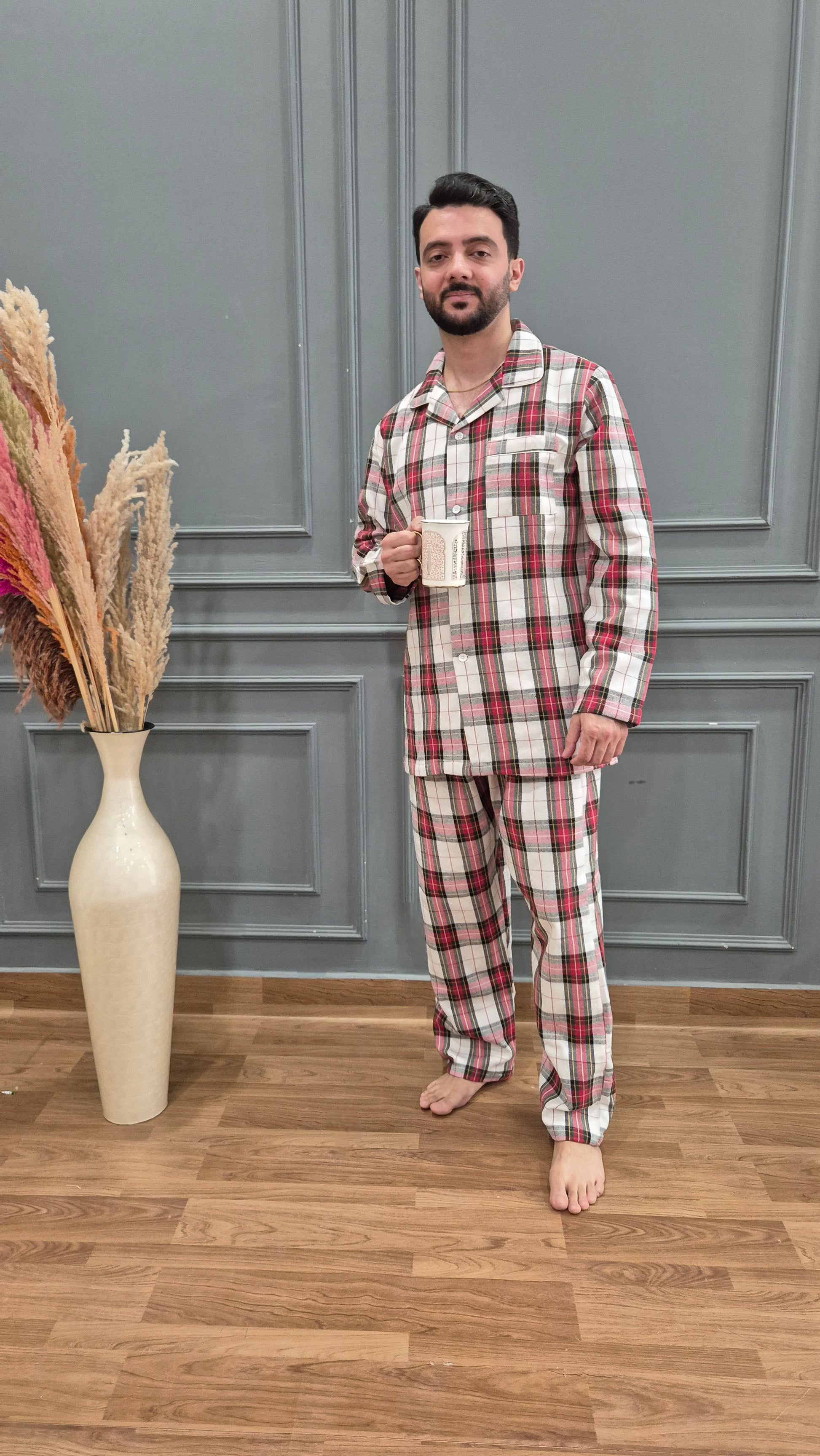 Cozy winter flannel nightsuit sets in a classic red, black, and white plaid pattern. Each set includes a collared shirt and matching pants for comfortable sleepwear. Made from warm flannel fabric for chilly winter nights. Perfect for both kids and adults seeking cozy comfort.