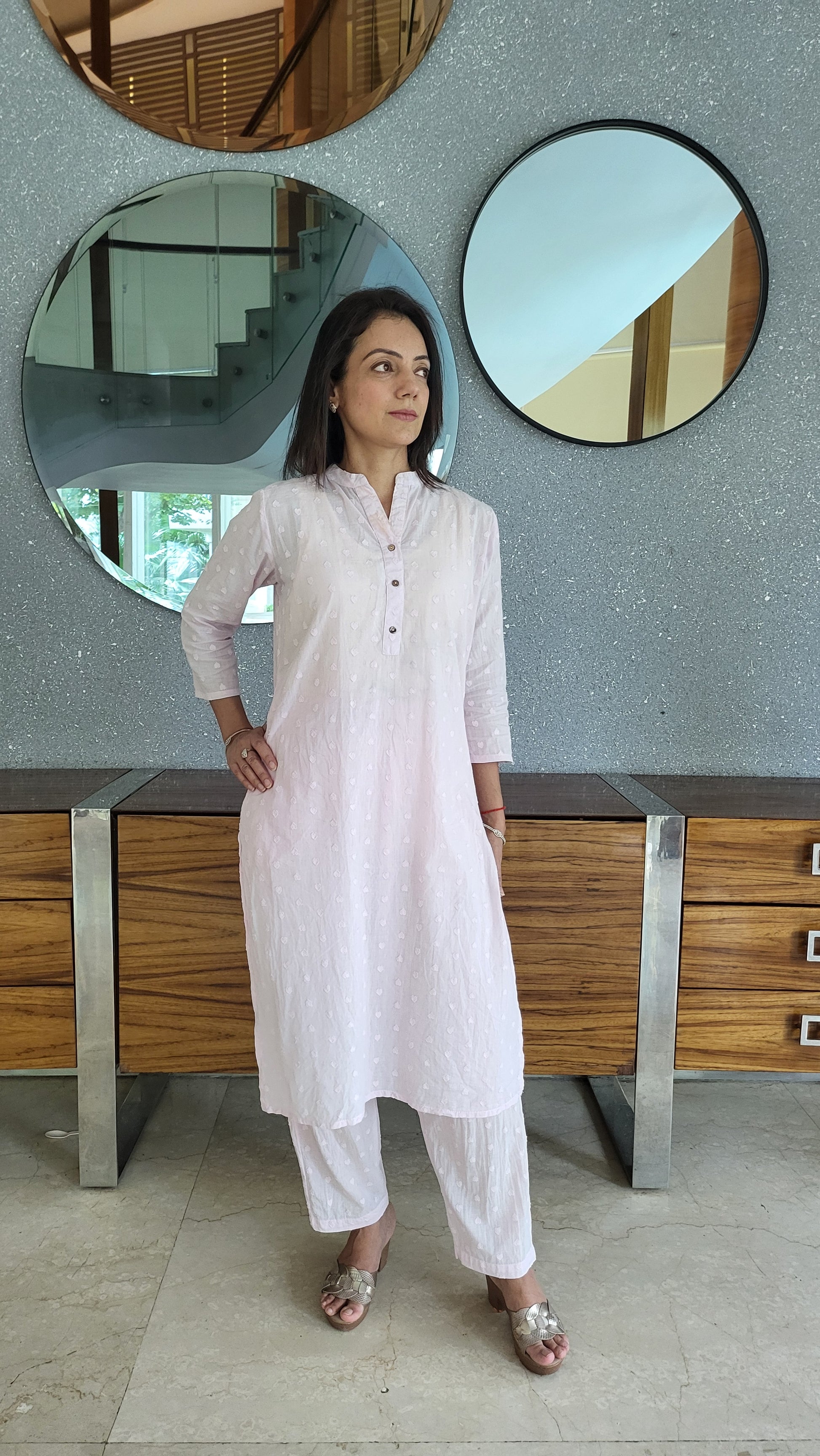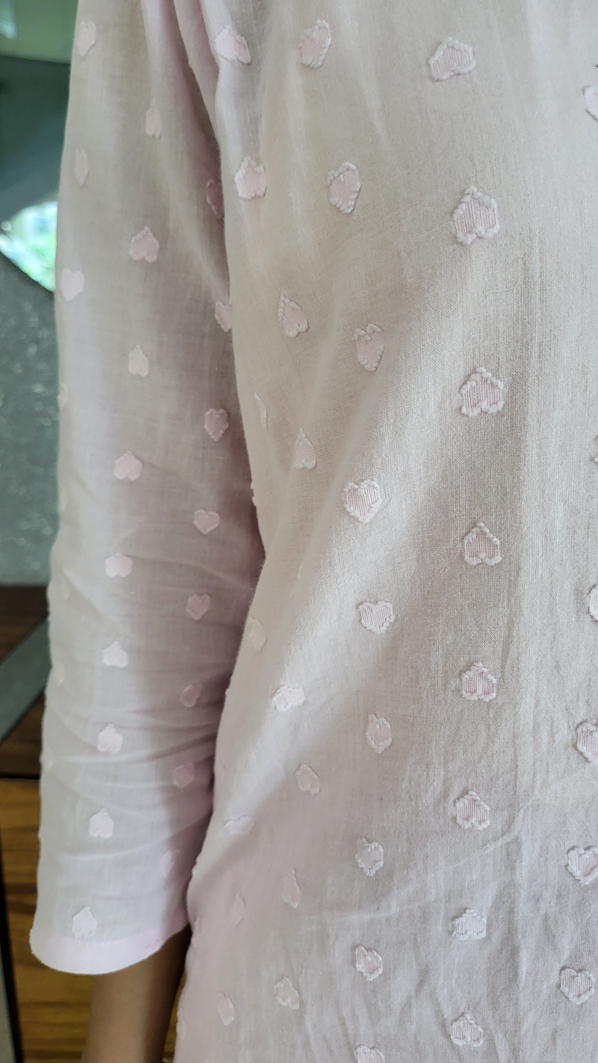 Add a touch of elegance to your ethnic wardrobe with our pink kurta set in luxury Cotton. Featuring an intricate heart pattern and classic buttoned placket, this comfortable and stylish outfit is perfect for any occasion. Its ideal for women who appreciate traditional Indian attire with a modern twist, perfect for everyday work as well as gifting.